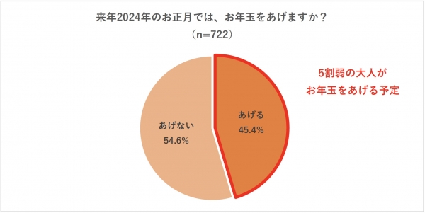 「来年2024年のお正月では、お年玉をあげるか」の質問に対し回答は、「あげる」が45.4%と、2024年は約半数の人がお年玉をあげる予定であることがわかった。