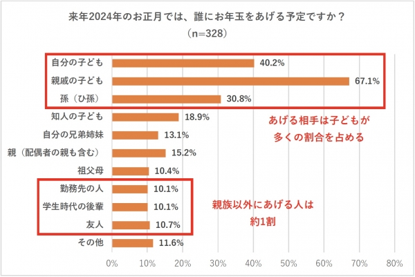 ②来年2024年は5割弱の大人がお年玉をあげる予定。あげる相手は最多が「親戚の子ども」67.1%、次いで「自分の子ども」40.2%、「孫(ひ孫)」30.8%。親族以外の「勤務先の人」「学生時代の後輩」「友人」にあげる人はそれぞれ約1割。