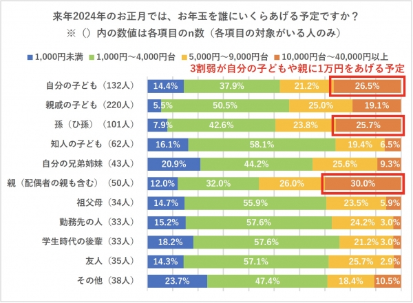 2024年にお年玉をあげる予定であると回答した328名に、あげる相手を質問したところ、最多が「親戚の子ども」67.1%、次いで「自分の子ども」40.2%、「孫(ひ孫)」30.8%と、子どもにあげる割合が高かった。金額はどの対象も「1,000円台〜4,000円台」が最も多く、「親」「自分の子ども」「孫(ひ孫)」に10,000円以上をあげると回答した人がそれぞれ3割弱いた。親族以外にあげる人は、「勤務先の人」10.1%、「学生時代の後輩」10.1%、「友人」10.7%で、それぞれ約1割だった。