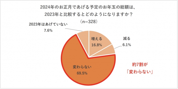 来年2024年にお年玉をあげる予定があると回答した328名に「来年2024年にあげる予定のお年玉の総額は、今年2023年と比較するとどのようになるか」と質問すると、「変わらない」が69.5%と最多だった。円安や相次ぐ値上げで家計が圧迫される中でも、お年玉の出費は昨年2023年と変わらない人が7割強であることがわかった。