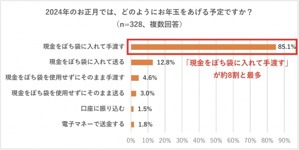 さらに来年2024年にお年玉をあげる予定があると回答した328名に「来年2024年のお正月では、どのようにお年玉をあげる予定か」と質問すると、「現金をぽち袋に入れて手渡す」が85.1%と最多だった。それ以外は「電子マネーで送金する」1.8%、「口座に振り込む」1.5%と1割にも満たず、お年玉のやりとりにおいては直接会って手渡すのが一般的であることがわかった。