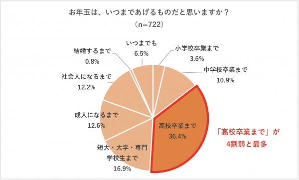 「お年玉は、いつまであげるものだと思うか」の質問に対し回答は、最多が「高校卒業まで」36.4%、次いで「短大・大学・専門学校生まで」16.9%、「成人になるまで」12.6%だった。