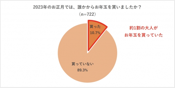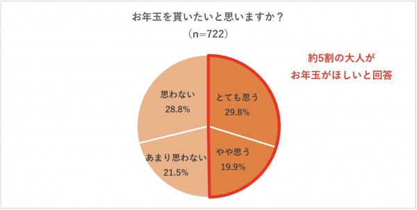 「今年2023年のお正月では、お年玉を貰ったか」の質問に対し回答は、「貰った」が10.7%で、2023年にお年玉を貰った大人は約1割にとどまった。その一方で、「お年玉を貰いたいと思うか」の質問に対し回答は、「とても思う」が29.8%、「やや思う」が19.9%と、約5割の大人がお年玉を貰いたいと思っていることがわかった。