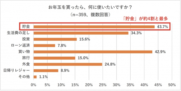 「お年玉を貰いたいと思うか」の質問に対し「とても思う」「やや思う」と回答した359名に貰いたいお年玉の金額を質問したところ、「10,000円台」が43.2%と最多だった。また、「お年玉を貰った場合に何に使うか」と質問したところ、最多が「貯金」43.7%、次いで「買い物」42.9%、「生活費の足し」34.3%だった。