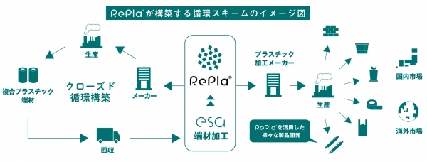 シモジマとサガシキは、それぞれの製品企画力と強力な販売網を生かし、包装フィルムなどの製造過程で生じる廃プラスチックの回収とRepla®を活用した製品開発を進め、市場への導入を図ります。