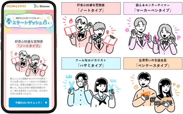 学生にとって身近な文具を題材とした2つのコンテンツで、1つ目は、5つの問いに答えることで文具にちなんだ6タイプから自分の性格タイプを診断できる「ついやってみたくなる文具タイプ診断」。2つ目は、そのタイプ診断に合わせた今週の運勢やラッキーアイテムの文具、勉強方法がわかる「毎週更新の占いコンテンツ」を3月から5月下旬までの12週にわたってお届けします。これらのコンテンツのご提供から、新学期におけるクラスメイトとのコミュニケーションのきっかけとなることを目指します。