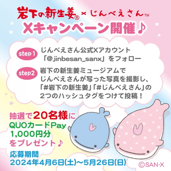 コラボカフェ期間中、岩下の新生姜ミュージアムのじんべえさんコラボメニューや館内のじんべえさん装飾等を写真に撮ってXに投稿すると、抽選で20名様にQUOカードPayが当たるキャンペーンを実施します。