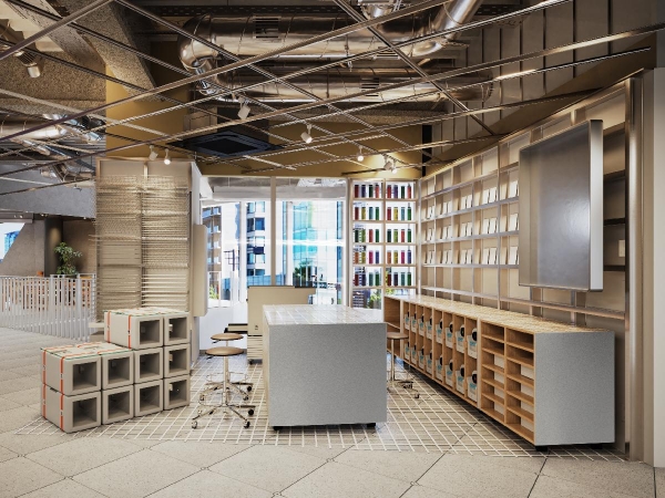 事務室やまちのコンビニなど、身近な日常に存在するコピー機。誰もが使い手であると同時に作り手になれる場としてのコピーコーナーを着想に、商業施設内にありながら、さまざまなものを日々生産・直売するマイクロファクトリーとして空間を設計しました。コピー機(リソグラフプリンター)を囲むように、作業台とインク、紙などの素材や、オリジナルプロダクトが所狭しと並びます。