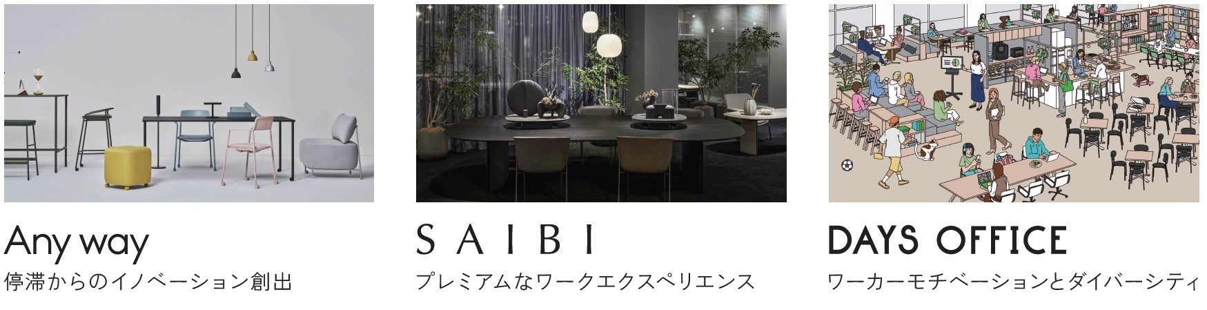 今回のキーワードは『さあ、つぎの「はたらく」へ。』とし、お客様が目指す理想の「はたらく」のあり方を探す旅をコンセプトに、コクヨの3ブランドである「Any way」、「SAIBI」、「DAYS OFFICE」による3つの世界を体験いただけます。