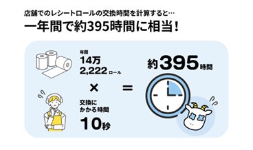 最後に、紙レシートロール数の換算値(14万2,222個)に、店舗での紙レシートロール1個の平均交換時間(10秒)を掛けると、1年間に削減した紙レシートロール交換時間は約395時間となります。コスト同様、店舗側における交換の手間は、人件費にも大きく影響していることが分かります。