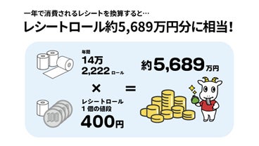 次に、全長約8,960kmを紙レシートロール1個の平均の長さ(63m)で割ると、紙レシートロール14万2,222個分となり、さらに紙レシートロール1個の平均価格(400円)を掛けると、1年間の紙レシートロール削減金額は約5,689万円となります。いつも何気なく手渡されている紙レシートも、積もり積もれば店舗側にとって大きなコスト負担となっていることが分かります。