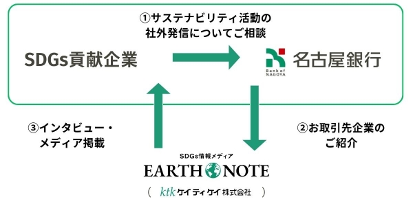 今般、名古屋銀行から、サステナビリティ活動に取り組む取引先をご紹介いただき、当社のEARTH NOTE(アースノート)に記事を掲載するという協業を開始しました。具体的には、地域に根差したSDGs貢献企業にEARTH NOTE(アースノート)がインタビューを行い、取組事例をWEB記事として発信します。これにより、広く活動内容をアピールすることで、持続可能な社会実現のためのアイデアを共有し、我が国におけるSDGs達成に向けた取り組みをより活性化してまいります。