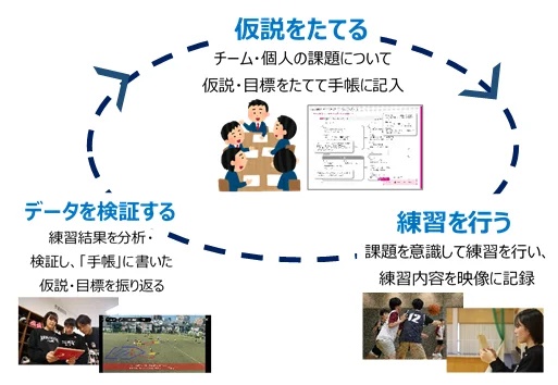 ・ 個人・チームの目標に向けた課題を「仮説」としてたて、それを練習で「実行」し、結果を「検証」する活動を日々行います。
