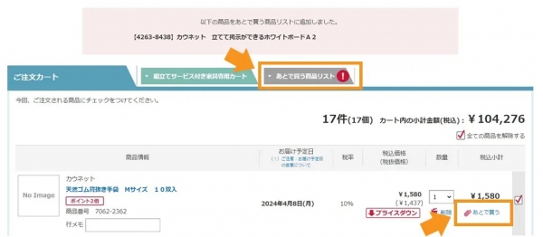 これまで「カウネット」のEコマースサイトでは、お客様がショッピングカートに追加した商品を一時保管できる機能が無かったため、今すぐに購入したい別の商品がある場合、先にカートに入れていた購入検討中の商品を一度削除した上で購入する必要がありました。このたび、購入検討中のカート内商品をストックでき、サイトを再訪した際に一度購入を見送った商品について探す手間をなくし、お客様の購買業務効率を高める「あとで買う機能」を導入いたします。さらに、「あとで買う商品リスト」に登録している商品が値下げした際にメールで通知する機能も追加され、お得なタイミングを逃すことなく購入できるようになりました。
