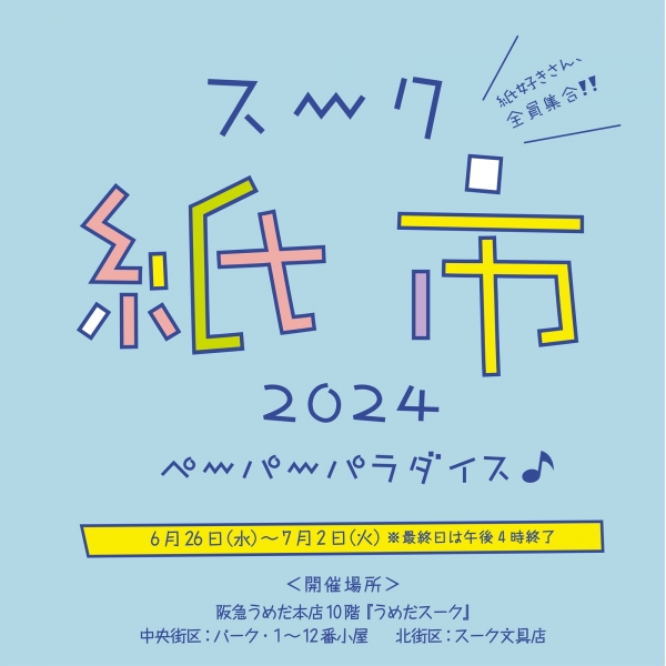 阪急うめだ本店 10階『うめだスーク』では、6月26日(水)~7月2日(火)まで、今年で8回目を迎える人気イベント「スーク紙市2024」を開催します。古今東西問わず、あんな紙!こんな紙!を見つけるのが楽しい、“紙パラダイス”。可愛い紙はもちろん、紙を更に楽しくしてくれるスタンプやインク、雑貨など、総勢約100ブランドが登場します。ペーパー縁日やスタンプラリーなど、会場ならではのイベントや今年初開催となるワークショップも見逃せません。