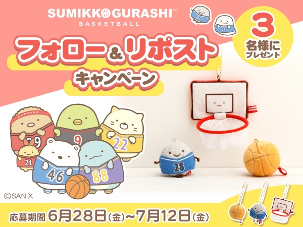 そして今回のコラボを記念し、すみっコぐらし公式Xをフォロー、対象のポストをリポストすると「バスケぬいぐるみセット」が抽選で3名様に当たるキャンペーンも開催します。