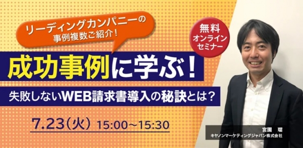 キヤノンマーケティングジャパン株式会社(代表取締役社長:足立正親)は、WEB請求書を導入する際のポイントについて解説する無料ウェビナー「成功事例に学ぶ!失敗しないWEB請求書導入の秘訣とは?」を2024年7月23日(火)に開催します。