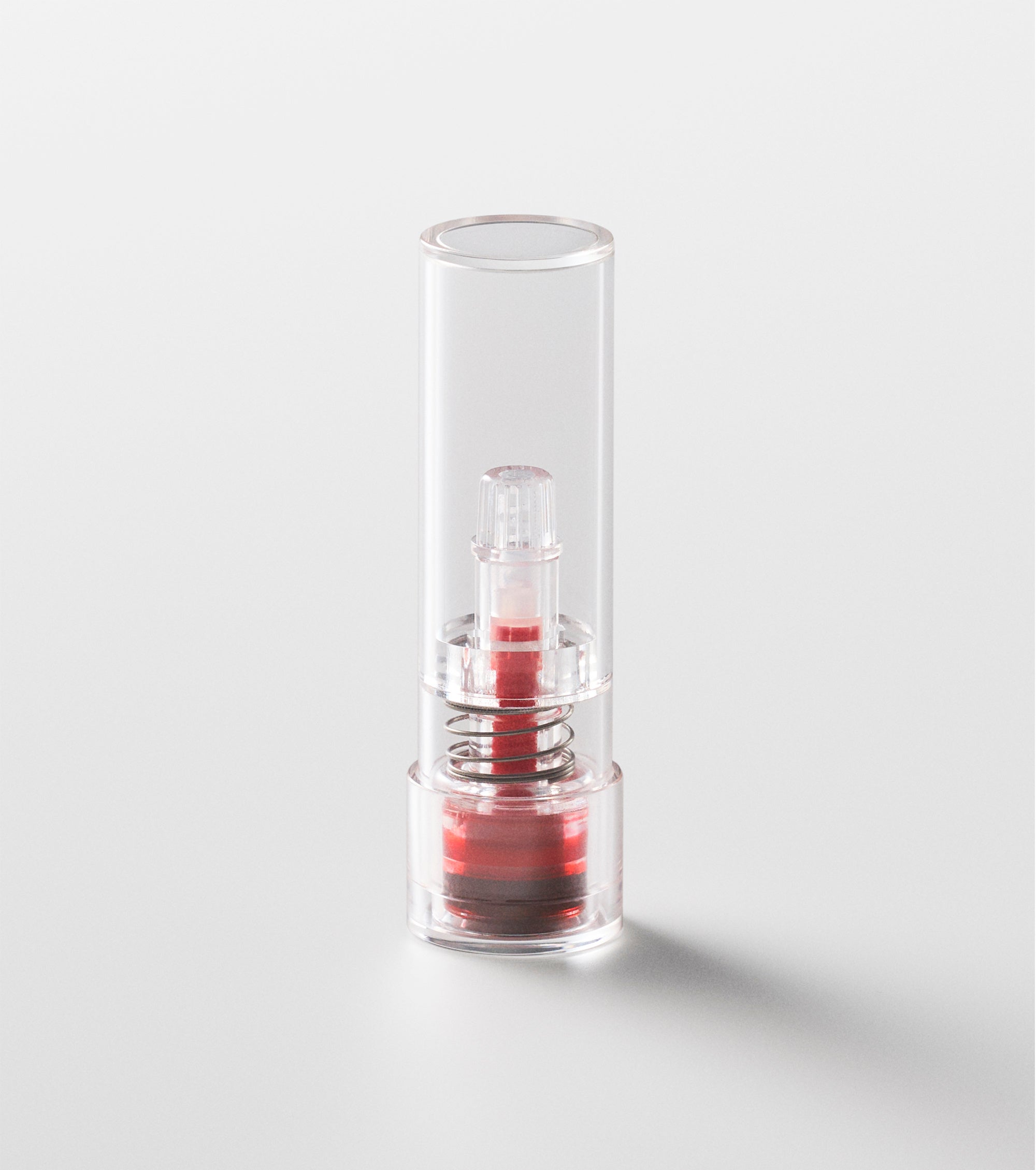 スポンジに含んだ朱のインクが印面へと浸透し、バネ式のギミックを伝って押印できる。シンプルでありながら無駄のない洗練された構造美がシャチハタにはあります。そんな構造を敢えて可視化させることで、物の持つワクワク感や、押印する楽しみを表現したいと考えました。