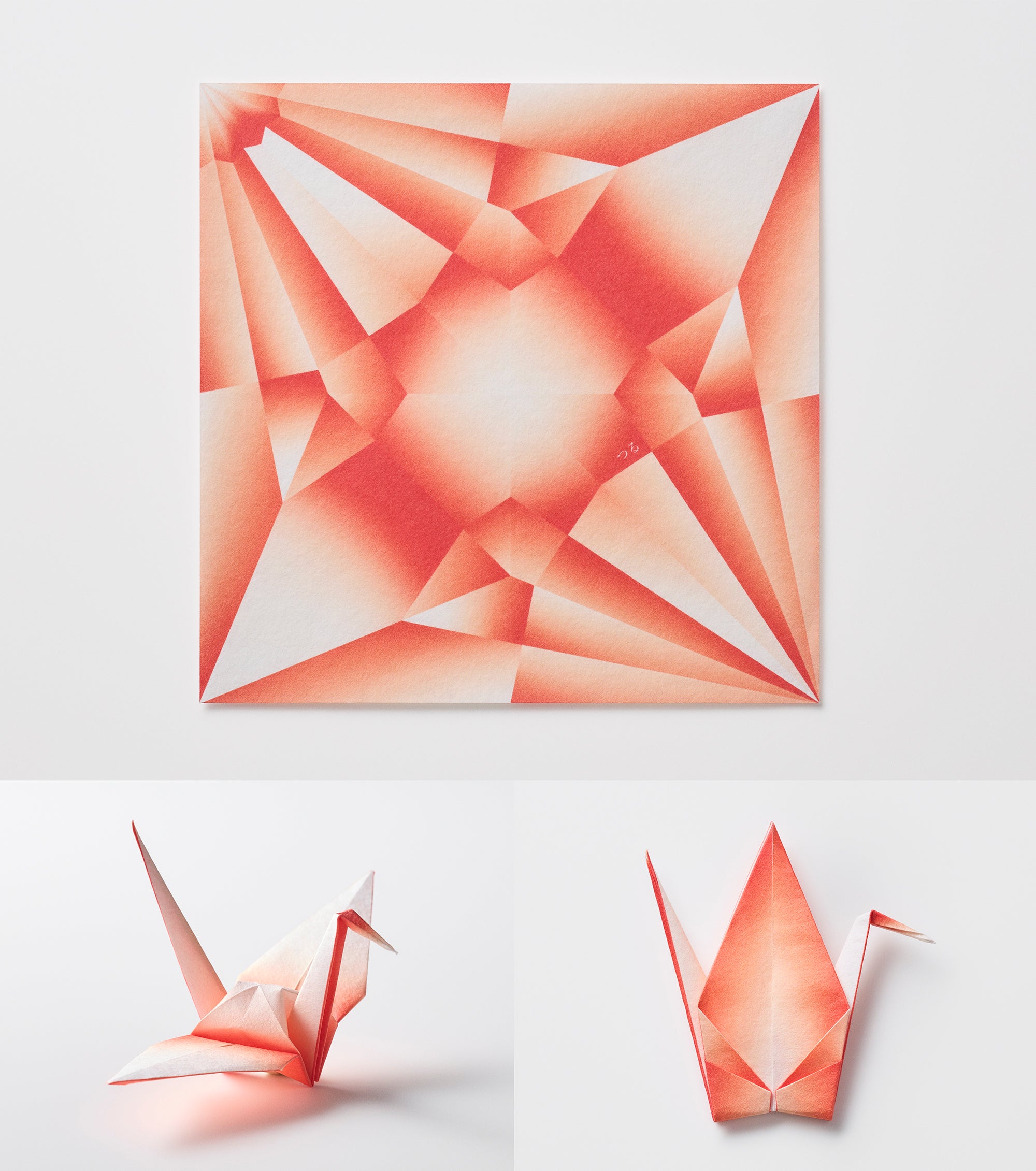 各面のグラデーションによって折り目というしるしを可視化した折り紙です。グラデーションは紙の重なりで生じる影を強調し、完成品をより立体的で趣のある印象に仕上げます。折り目を線ではなく、さらなる効果を生むしるしに作り替えるアイデアです。兜や風車など他の折り紙にも展開が可能です。