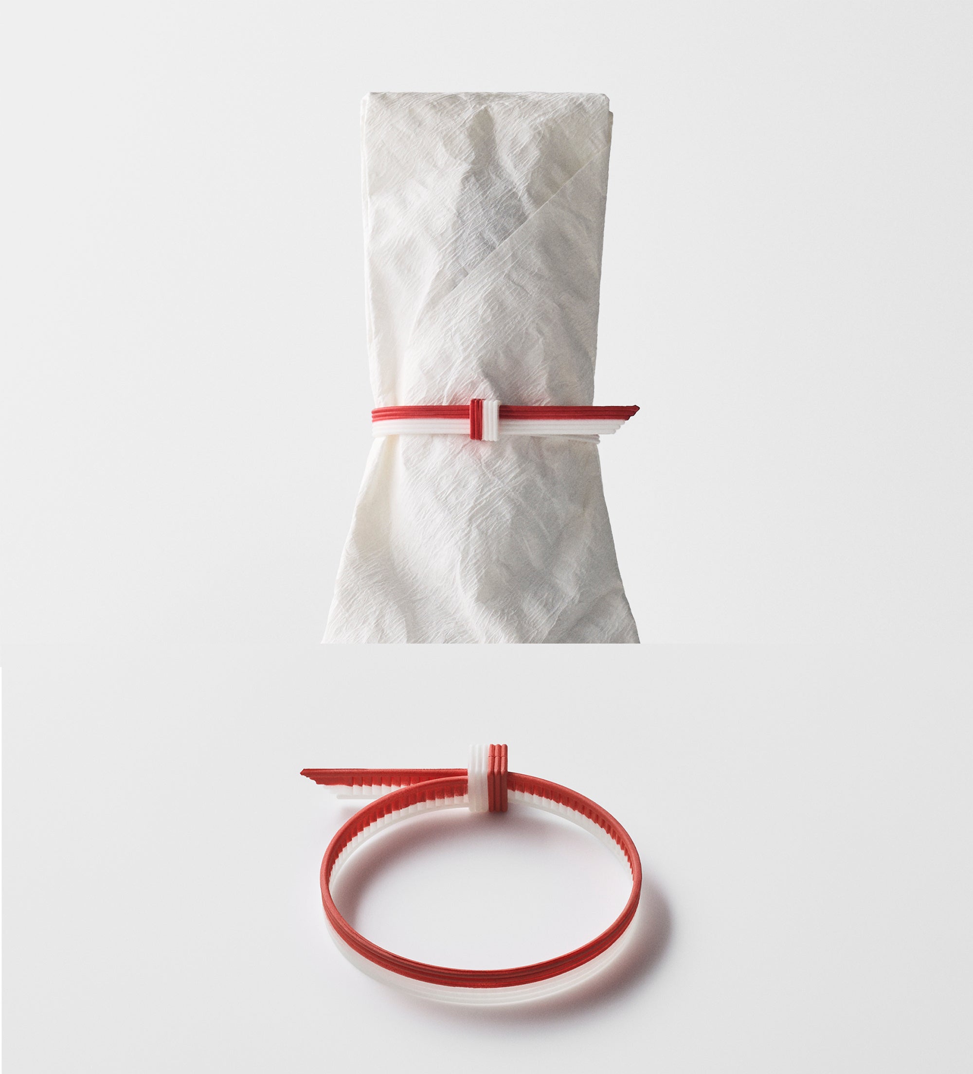 「結束バンドのハードな質感に水引を合わせたのが面白いです。今回のテーマに完全に呼応しているかと言われると悩みますが、完成度の高さに目を惹かれました。袋を縛る時にリボンではなく、こういうデザイン性の高い結束バンドを使うことで、さりげなく気を利かせられそうです」(中村)