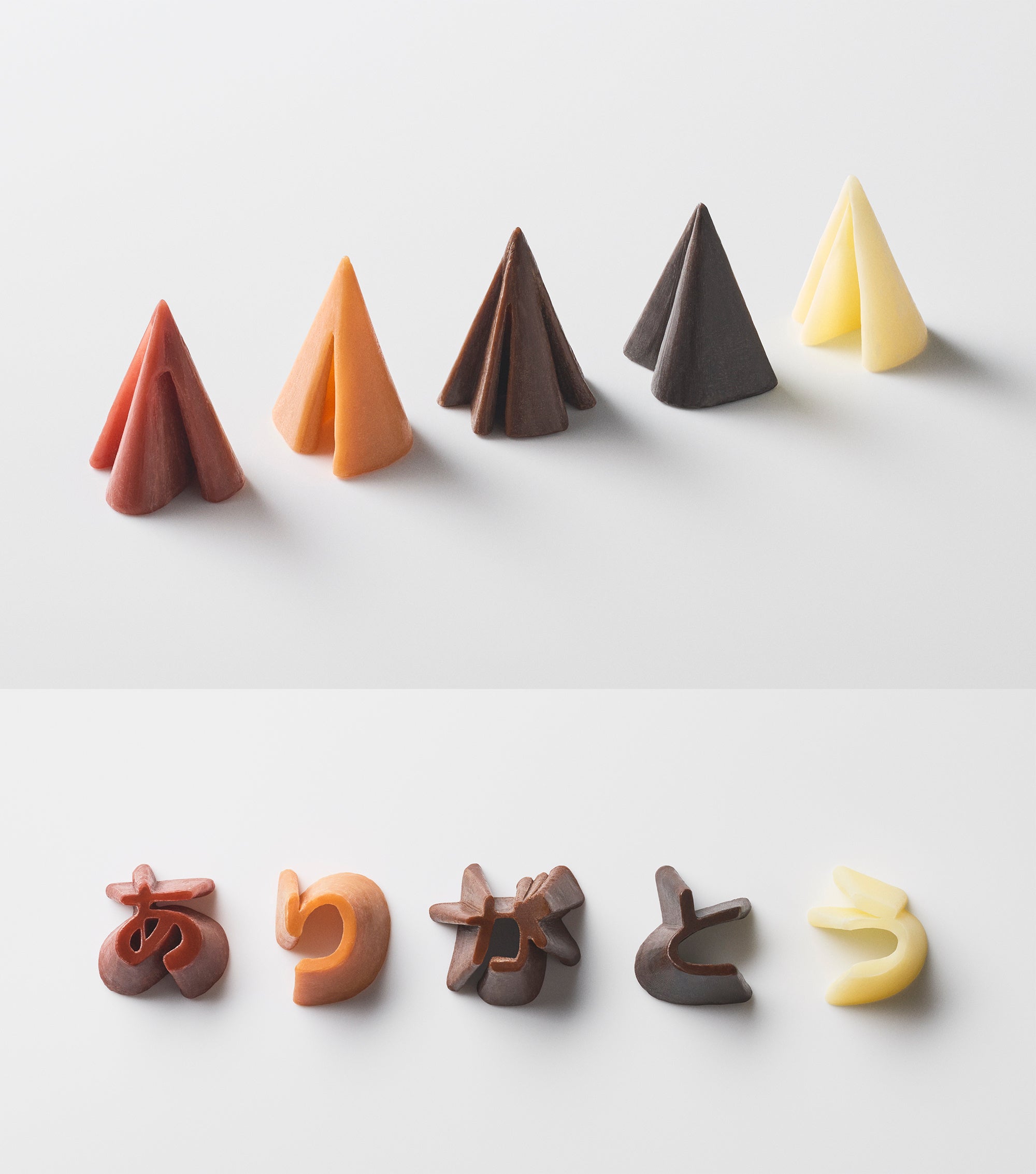 かじることで隠れた文字が可視化されるチョコレートです。誰かに感謝を伝える時に“ありがとう”のもじちょこを渡せば、かじった時にありがとうが文字としてふたたび相手の元に届きます。文字や言葉、想いを食べるという行為の中に可視化する、スイーツを素材にしたしるしの提案です。