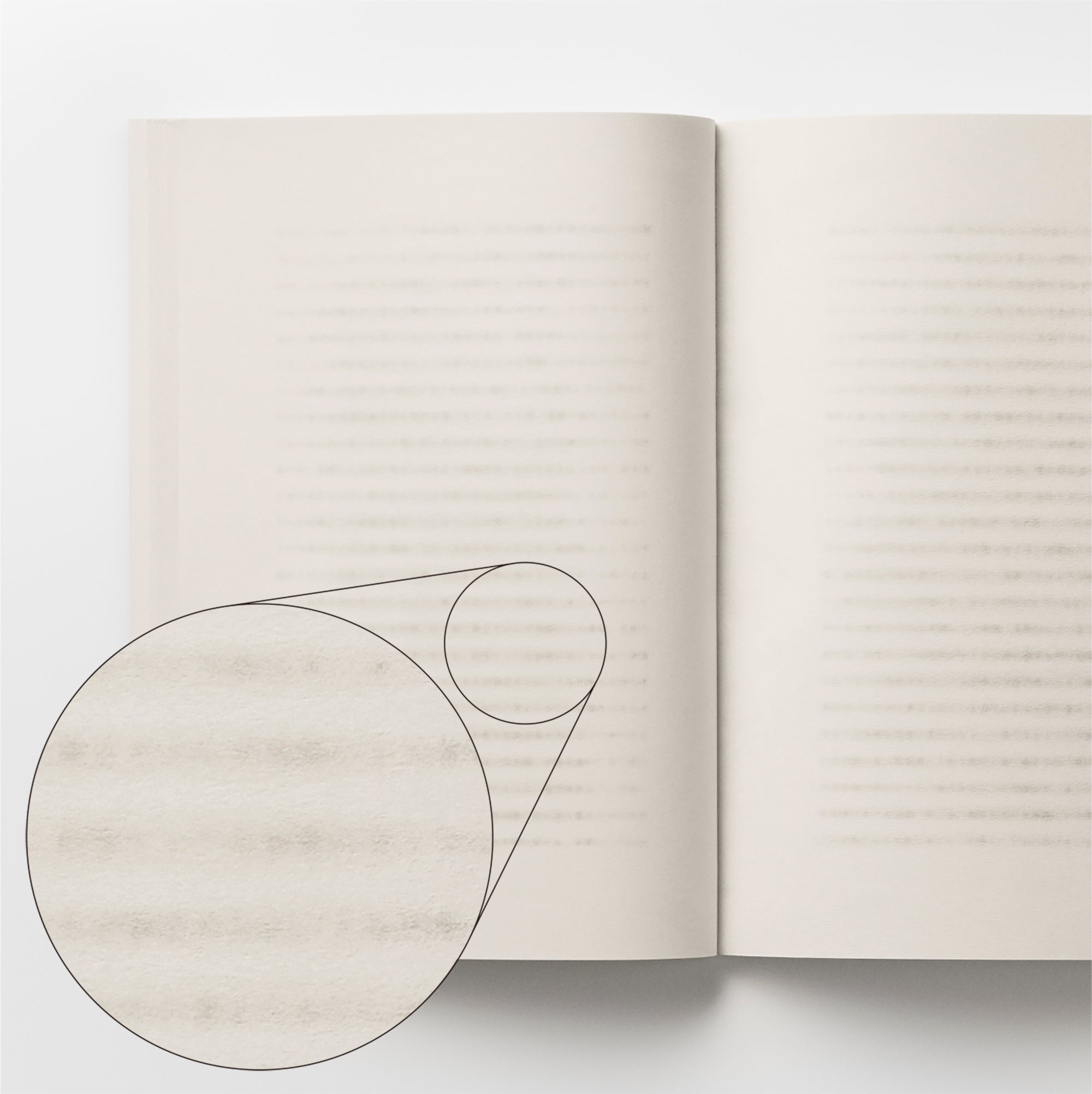 「白さはノートの価値でもありますが、高い緊張感をもたらすものでもあります。ノイズに満ちたこのノートは着想の一歩手前の頭の中に似ていて、イマジネーションを投影しやすい対象だと思います」(原)「図書館のざわめきのように、自分が書く文字以外の存在が思考を刺激してくれているように感じました。白い紙に向き合う時とは異なる、新しい書くという体験ができそうです」(岡崎)