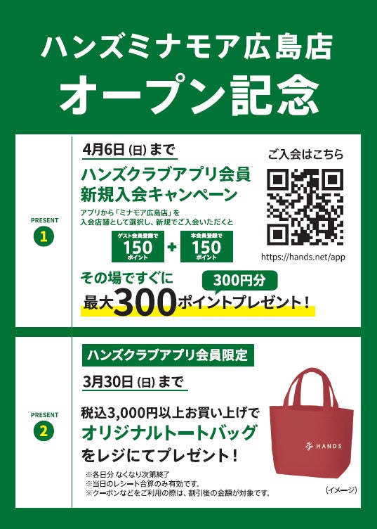 期間中、ハンズクラブアプリに「ミナモア広島店」を入会店舗として新規でご入会いただくと、その場で300ポイントプレゼント。