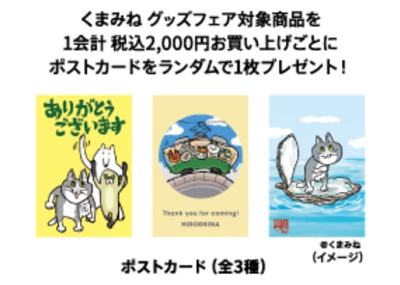 期間中は、くまみね グッズフェア対象商品を1会計税込2,000円お買い上げごとに今回開業を記念して特別に書き下ろしたポストカードを1枚プレゼントします。
