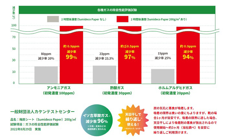 スミデコペーパーは、脱臭、防カビ・抗菌、調湿効果など、炭の優れた機能を持っています。通常は糊や樹脂を使って素材を固定しますが、当社の抄き込み技術により製造副産物の素材(炭)と古紙と水で製造しています。このため、通常の抄き込みに比べ炭の残存率が相対的に高くなり(当社比)、高機能な紙作りが可能になります。また、紙の特性を活かして様々な形状に加工できることから、靴の脱臭シートや畳の資材、その独特の風合いを生かして「SUMIDECO(スミデコ)」ブランドとしてブックカバーなどにも活用しています。