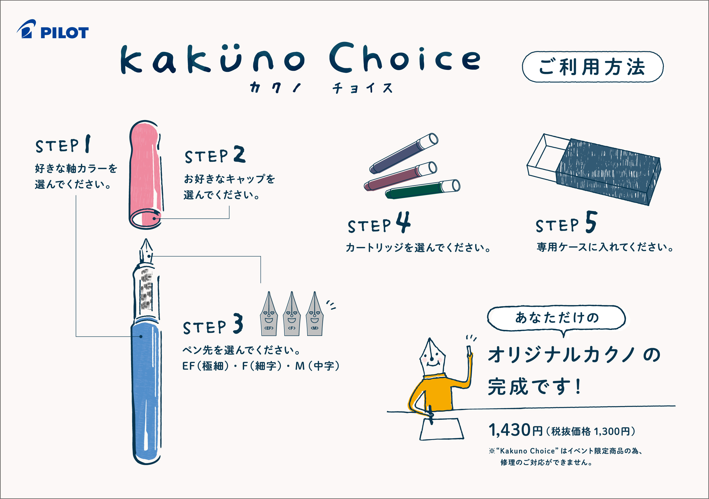 2つ目は、パイロットの万年筆「カクノ」を使った体験イベントです。「カクノチョイス」は、「キャップ」「ペン先」「軸」の3パーツを自由に組み合わせ、自分だけの万年筆を作ることができます。お気に入りの組み合わせを選び、その場で書き心地を確かめながら、自分にぴったりの筆記具を見つけることができます。ペン先は、極細字〈EF〉・細字〈F〉・中字〈M〉の3種類から選択可能。好みや用途に合わせたなめらかな書き心地を楽しめます。初めて万年筆を手にする方はもちろん、インクとの組み合わせを楽しみたい方にもおすすめです。