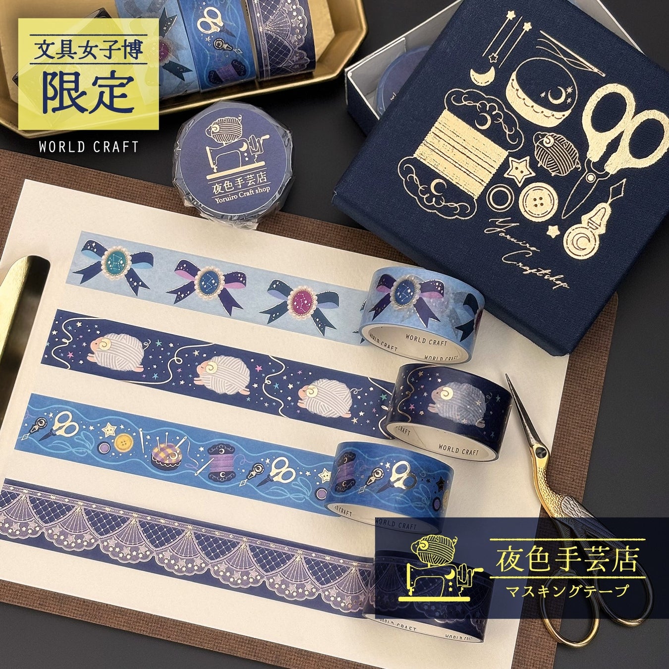 夜にのみオープンする架空の手芸店をイメージした、ゴールド箔入りマスキングテープが登場。絵柄は夜空色のリボン、夜空を駆ける毛糸玉のひつじ、裁縫道具、星柄レースの全4柄。