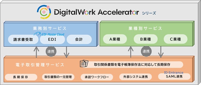 「DigitalWork Accelerator」シリーズは、電子帳簿保存法に対応した電子取引管理サービス、請求書受取サービスに加え、業務別アプリケーション・業種向けサービスを連携させることで、DX推進と業務変革の実現を支援するクラウドサービスです。企業の「情報資産」であるドキュメントを安全に管理・保存し、多様な手段で適切に分類・検索できる環境を提供します。さらに、複合機やさまざまなサービスと連携し、社内外の情報をスムーズに活用可能な「価値ある資産」へと変革します。