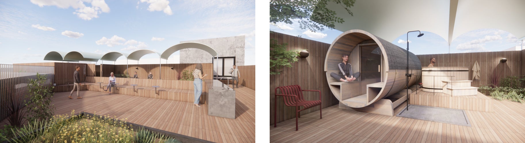 施設内には、心身のリフレッシュや健康的な働き方を支える空間を整備します。屋上には、外気を感じながら“ととのう”ことができるサウナ等のリフレッシュ機能やテラスを設け、業務の合間や終業後にリセットできる環境を用意します。“働く時間”だけでなく、生活そのものの質を高めることで、良い仕事と良いつながりを生み出します。