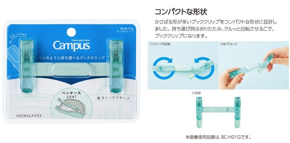 教科書を開いたまま快適に使える折りたたみ式のブッククリップ。くるっと回すとペン型になり使い終わったらペンケースにすっきり収納可能。左右のクリップが独立して動く構造で、ページの厚みが違ってもしっかり固定。半透明で短めの上クリップは文字を隠しにくく、読みやすさにも配慮されています。