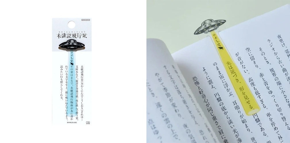 UFOが本の上に飛来し、読みたい場所へ1秒アクセスできるユニークな栞。本を閉じた状態ではUFOが浮遊しているように見え、ページを開くと助けを求める牛と一緒に文章をアブダクション。次に読みたい一文を照らすように目印をつけてくれるので、開いた瞬間に視線が自然と目的の場所へ向かいます。思わずクスッと笑える遊び心と、しっかり使える機能性を両立した、読書時間をもっと楽しくするアイテムです。