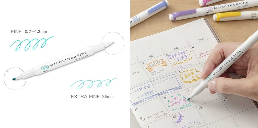 マイルドライナーの細字タイプ。線幅0.7mmと0.5mmの極細チップを搭載し、文字や細かなイラストもすっきりきれいに描けます。固めのペン先で線幅が太りにくく、安定した書き心地も特長。マイルドライナーと同じインクを使用しているため、組み合わせて使えばトーンのまとまった、かわいらしいノートやメッセージカードづくりが楽しめます。