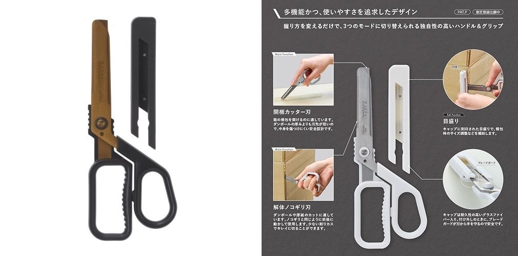 はさみ・開梱カッター・解体用ノコギリの3役を備えた多機能ハサミ。握り方を変えるだけで使い分けができ、チタンコート刃で切れ味と耐久性を両立しています。厚紙やダンボールも快適にカットでき、1cm間隔の目盛り付きで作業の正確さも向上。マグネット内蔵キャップ付きで、玄関の扉などに貼り付けて保管できるのも便利なポイントです。