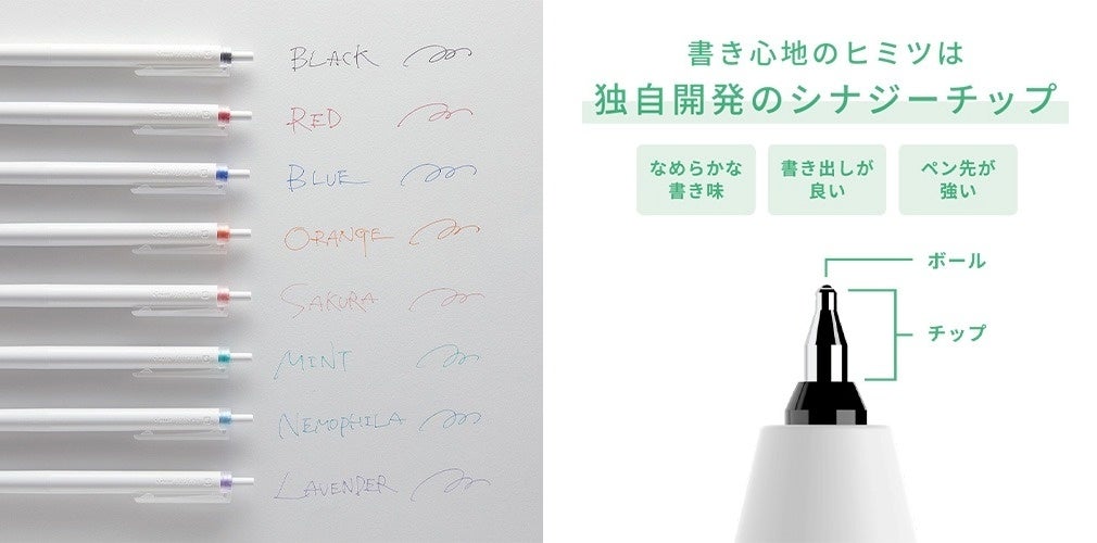 独自開発のシナジーチップを搭載したゲルボールペン。急いで書いてもなめらかさが続き、筆圧が強くてもかすれにくいのが特長です。シンプルなボディにさりげないワンポイントを添えたデザインで、使うシーンを選びません。安定した書き心地で、ノートやプリントへの書き込みなど、毎日の勉強時間をより快適にサポートします。