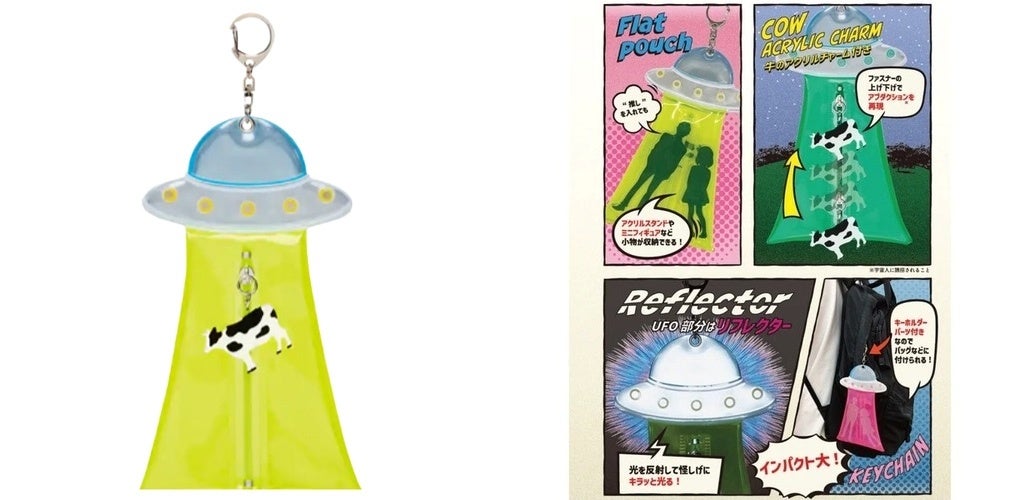 遊び心たっぷりの未確認飛行ポーチ。アクリルスタンドやミニフィギュアなどの小物を収納でき、ファスナーを開け閉めするたびに、まるでアブダクションを再現しているかのような仕掛けが楽しめます。UFO部分は光を反射するリフレクター仕様で、怪しげにキラリと存在感を演出。UFO×牛という独特の世界観がクセになり、持ち歩くだけで話題になるユニークなアイテムです。
