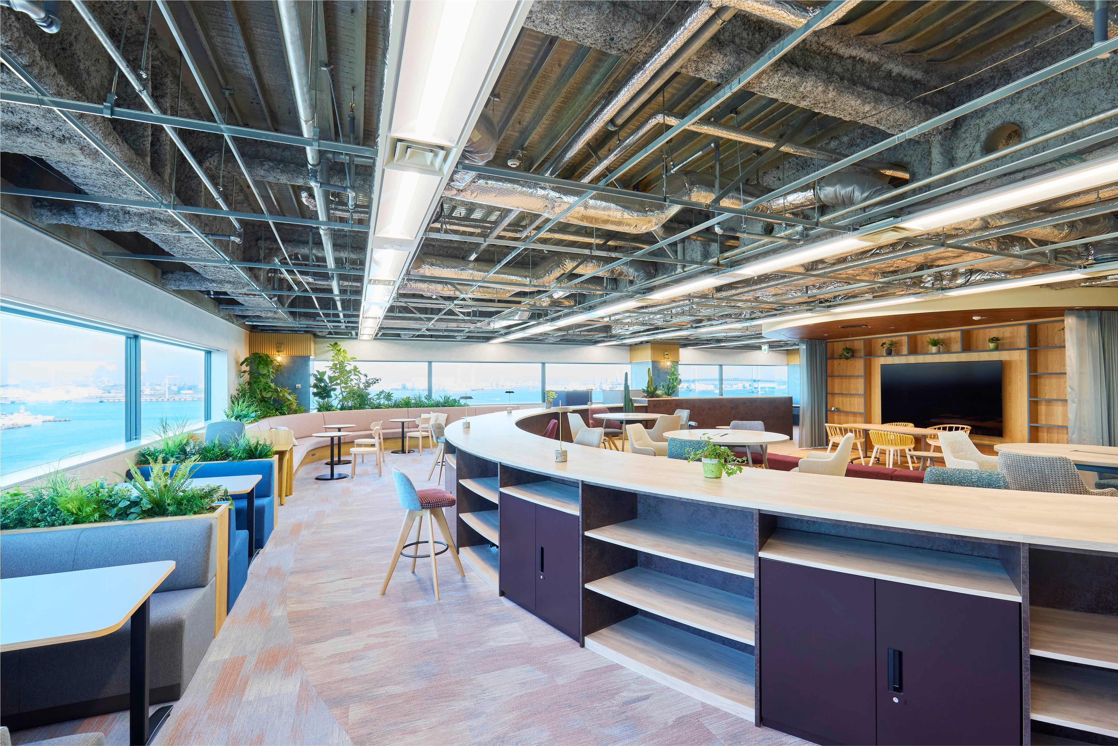 オフィスをぐるりと囲む窓からは、大さん橋や大観覧車など横浜の景色が一望でき、来訪者とワーカーともに眺望を楽しみながら、街とのつながりを感じることができます。