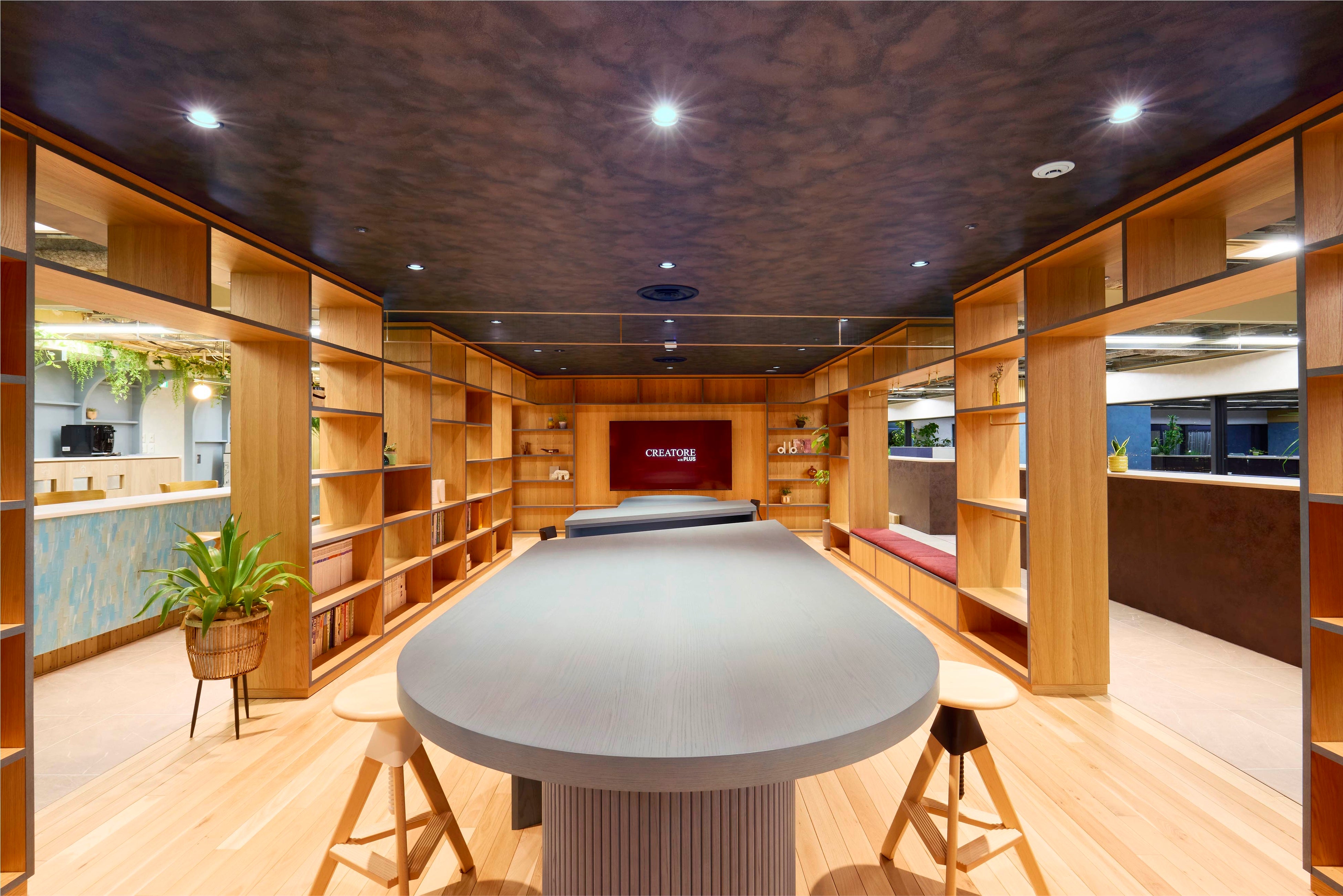フロア中央には、オフィスを構成するカラーやマテリアルが豊富に揃った「CREATORE with PLUS(クリアトーレ ウィズ プラス)エリア」を配置。全国5カ所のプラスのショールームである「CREATORE with PLUS」が培ってきた、お客様と共に創る考え方を踏襲した、ラボスペースです。