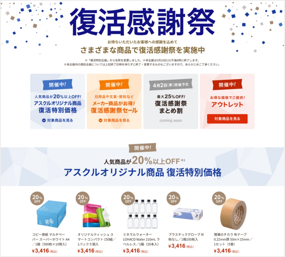 アスクル株式会社(本社:東京都江東区、代表取締役社長:吉岡 晃、以下「アスクル」)は、事業所向け(BtoB)通販サービス「ASKUL」「ソロエルアリーナ」において実施中の「復活特別企画」(※1)を拡大し、本日2月24日18時より「復活感謝祭」として開催します。期間中、メーカー100社超の商品約400点を大幅値下げするほか、3月2日18時からはオリジナル商品の復活特別価格対象を拡大し、約800点を20%以上オフで販売します。(※2)