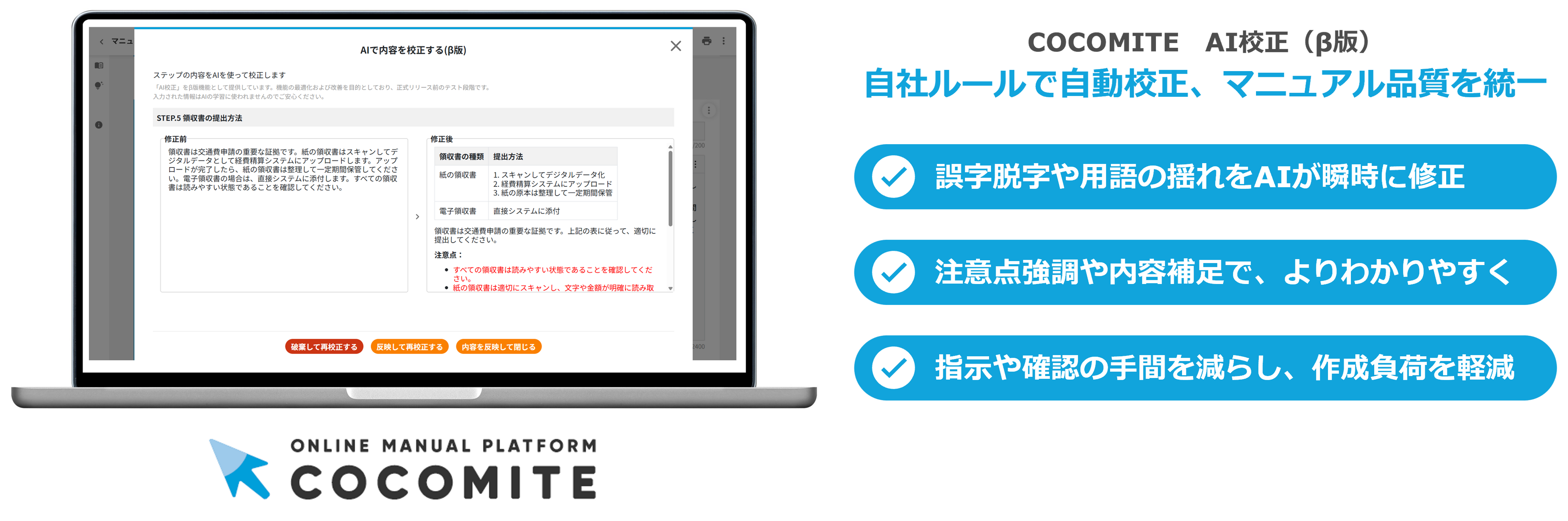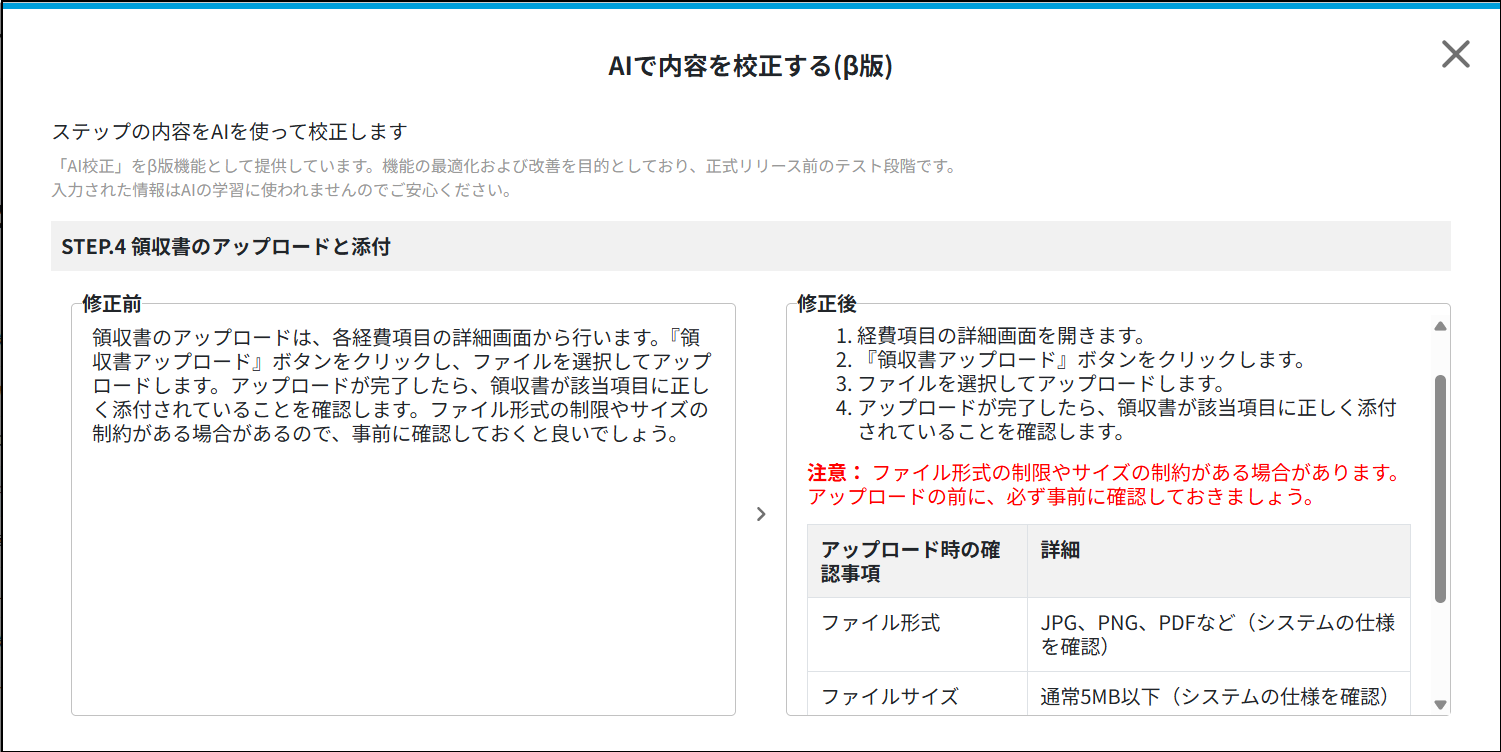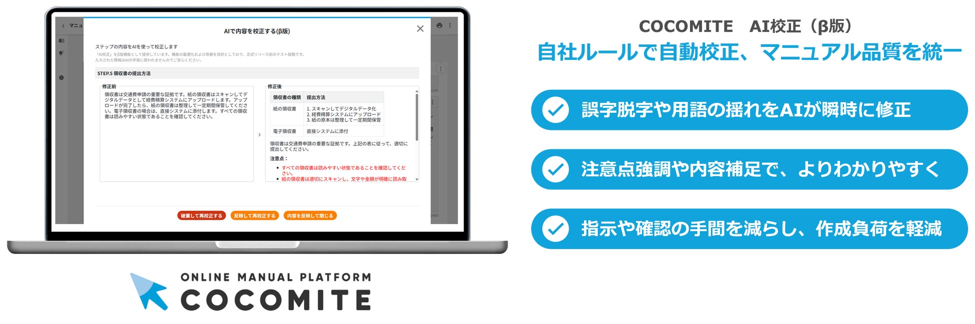 1.AIによる自動校正でマニュアルの品質を統制し、業務標準化を支援