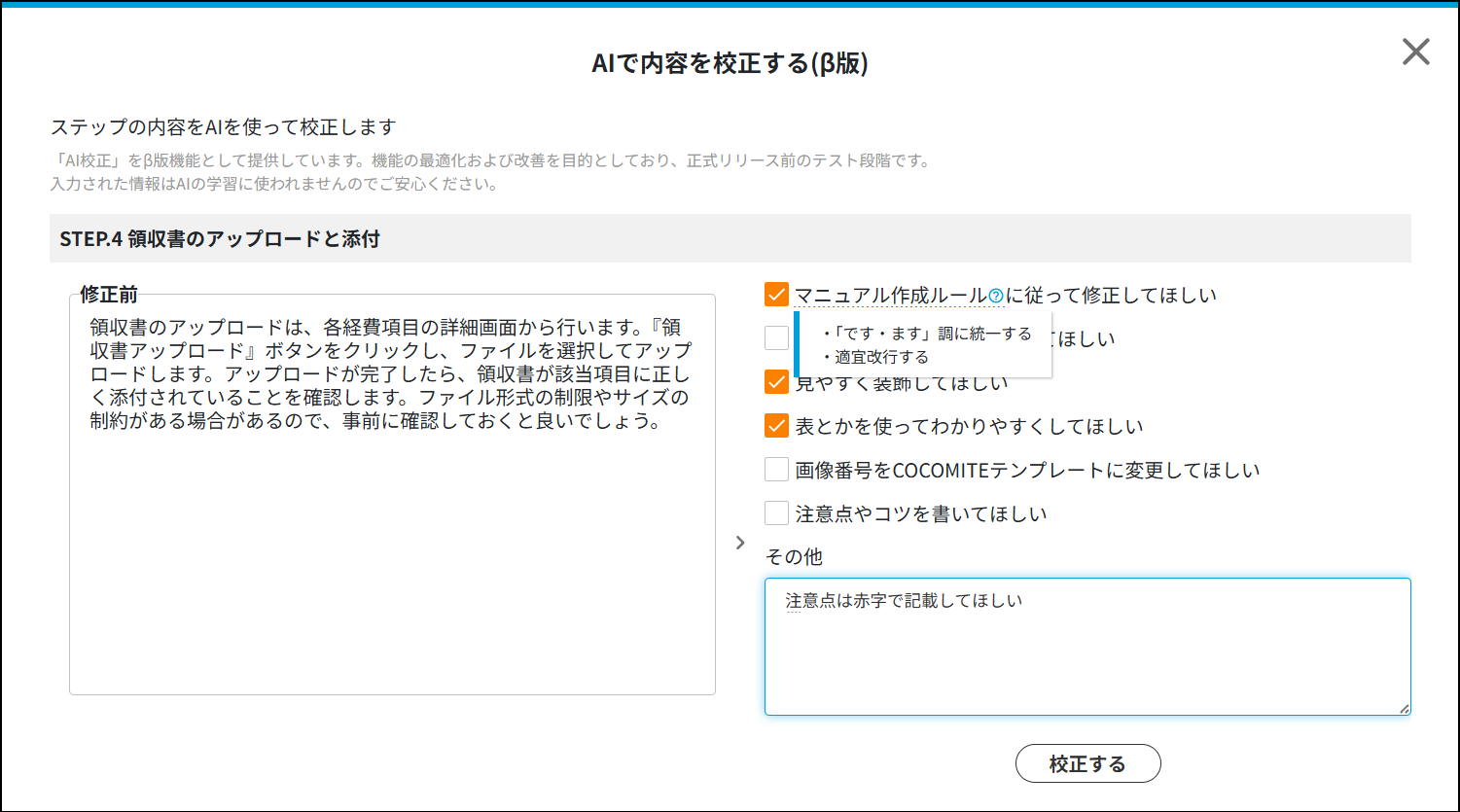 この課題に対して「COCOMITE」の「AI校正(β版)」は、あらかじめ設定した自社のマニュアル作成ルールを、即時に反映させることができる点を特長としています。誤字脱字の修正といった文章の整備にとどまらず、用語表記の統一、箇条書きや表形式への変換、注意点やポイント箇所の強調表示、不足内容の補足提案など、幅広い校正をAIが自動で行うことで、マニュアル全体の品質管理・統制を実現します。また事前に設定したルールに加え、マニュアル作成の都度、校正の指示を追加することも可能です。マニュアルの品質の統一によって誰でも正確に業務を遂行することができる環境を整え、業務の属人化やヒューマンエラーを抑制し、安定した業務運用を実現します。
