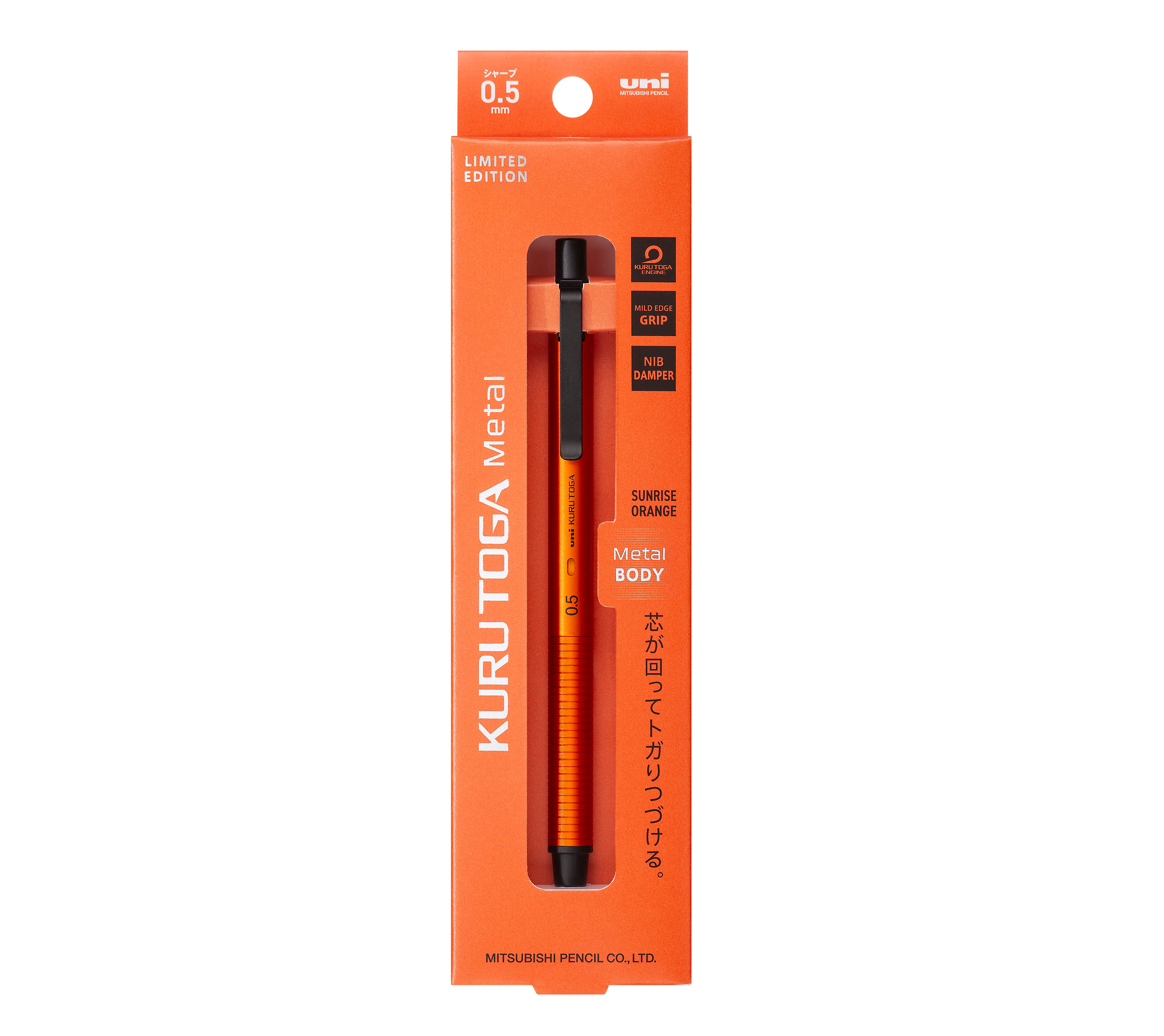 クルトガエンジン機構で芯が回ってとがりつづけるシャープペンシル「クルトガ」シリーズの「クルトガメタル」に、数量限定色のサンライズオレンジが登場。