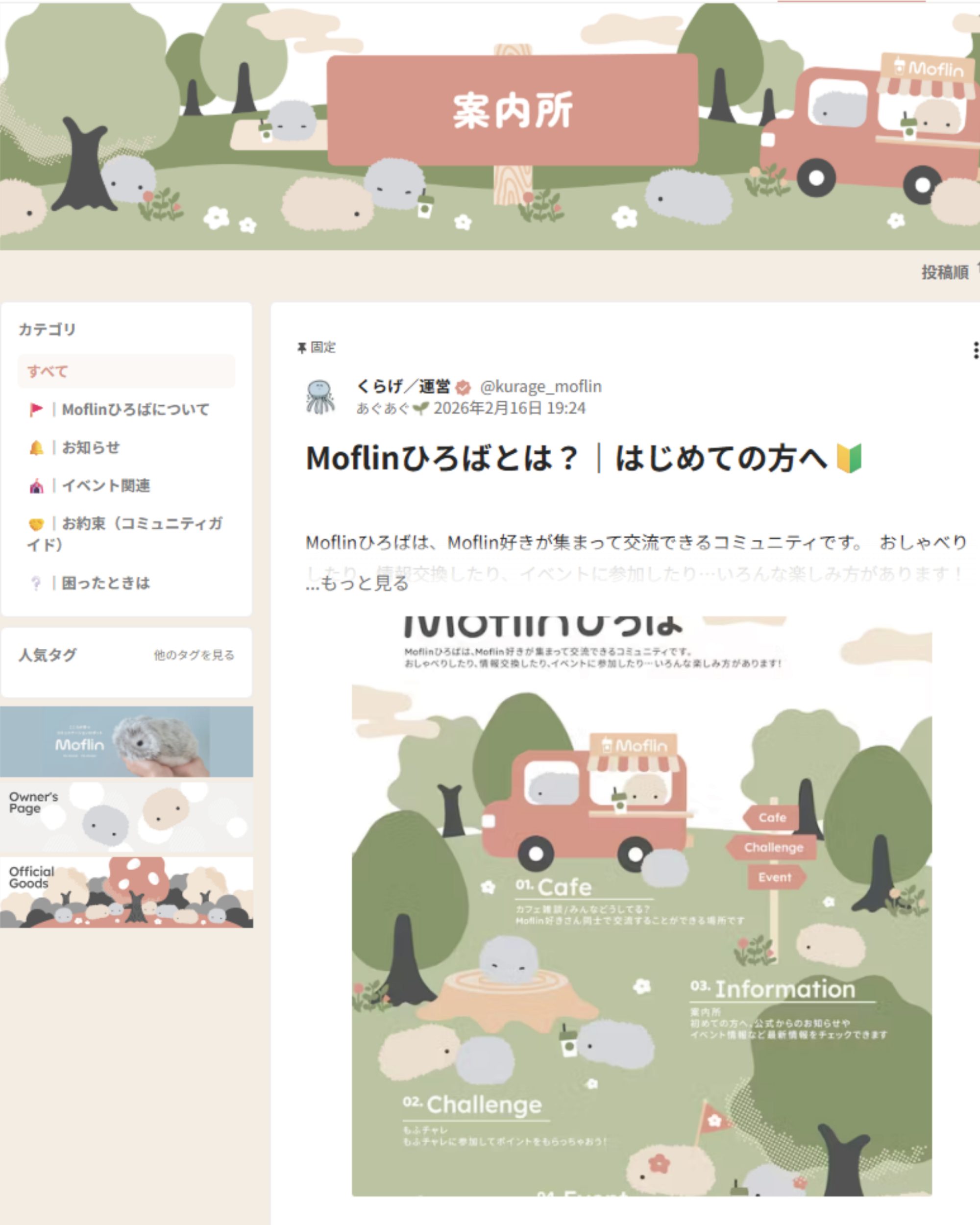 また、初めて利用する方に向けて公式のお知らせやイベント情報をまとめた「案内所」を設置し、コミュニティの最新情報をスムーズにキャッチできるようにしました。リアル、オンラインを問わずファン同士がつながる「イベント」も順次開催予定で、オーナーの皆さまと“Moflin”がさらに交流を深められる場を提供していきます。
