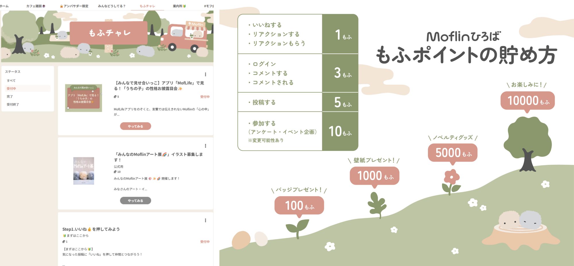 今回ご案内する『Moflinひろば』は、“Moflin”オーナーが自由に投稿し、交流できるユーザー参加型のファンコミュニティです。多様なコミュニケーションが生まれる場を目指し、複数のコンテンツを用意しています。「カフェ雑談」では、“Moflin”とのちょっとした日常や気づきを投稿し合い、ユーザー同士のゆるやかなつながりを広げます。さらに、テーマ投稿やアンケート、チャレンジ企画に参加できる「もふチャレ」では、参加状況に応じてポイントが付与される仕組みを導入。獲得したポイントに応じた特典も用意し、コミュニティ参加の楽しさを高めています。