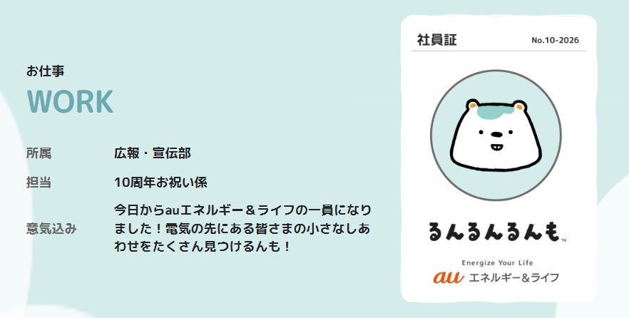 2026年4月1日、「auでんき」のサービス提供開始から10周年を迎えた記念としてauエネルギー&ライフ初のコーポレートキャラクター『るんるんるんも』が誕生。広報担当として入社しました。
