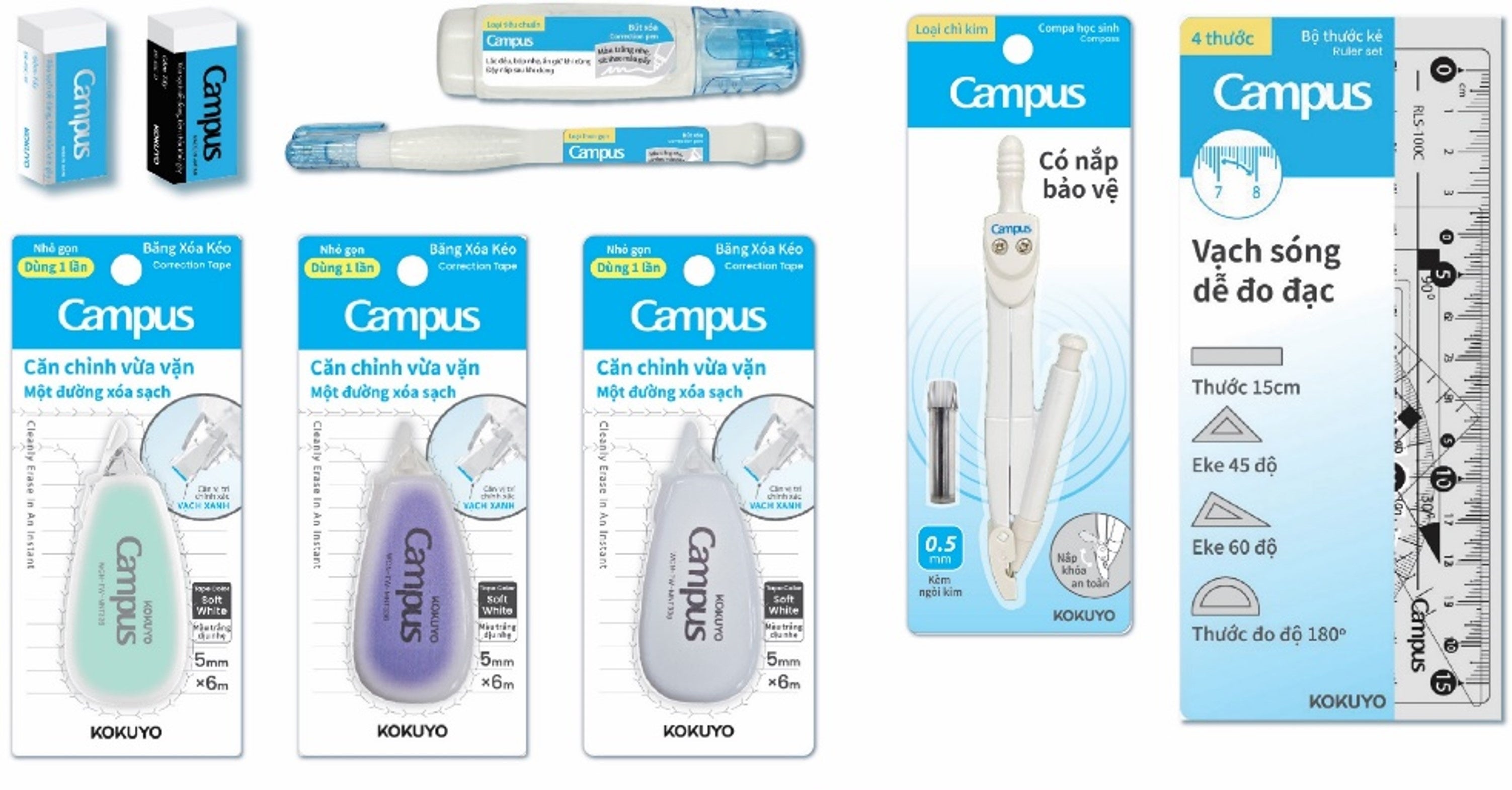 ベトナムオリジナルの商品として、ナチュラルカラーのインクで修正跡が目立ちにくい修正ペンや、針カバー付きで安心なコンパス等もラインアップしています。