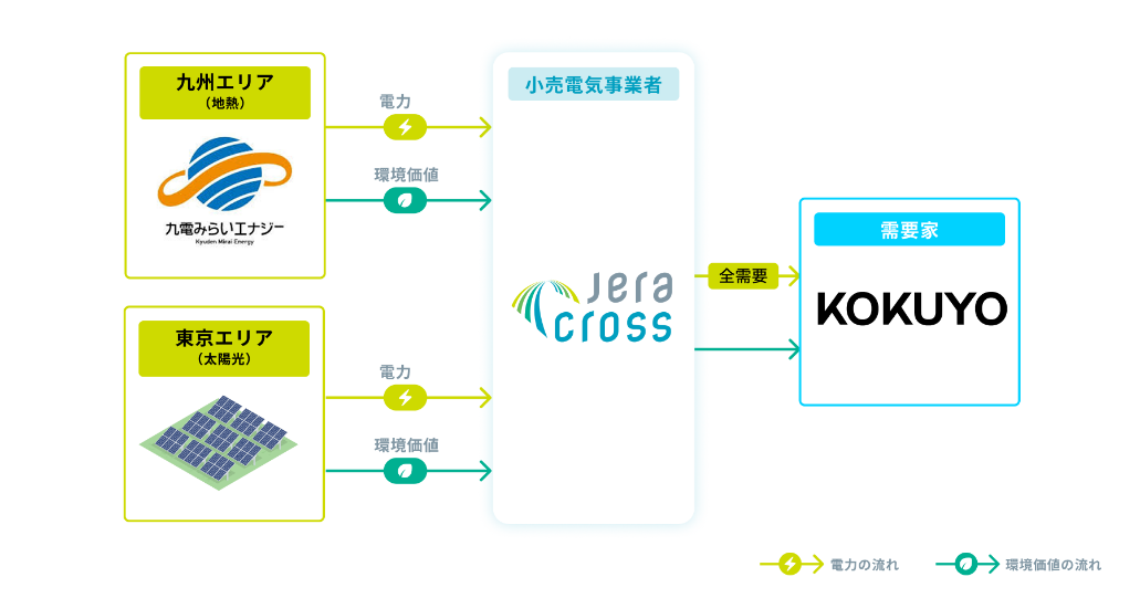 JERA Crossはアグリゲーターとして、九電みらいエナジー株式会社から調達した地熱由来の電力と、複数のオフサイト太陽光発電所の電力を組み合わせて、「THE CAMPUS」へ供給します。年間再生可能エネルギー供給量は約37.5万kWhを見込み、本スキームによる想定削減効果は年間約159t-CO₂(*1)です。